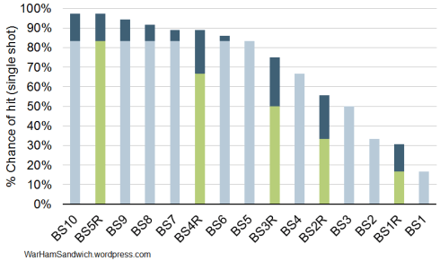 Rather than running the numbers in this post, have a look at my response to his comment at the bottom of this post. But where I took it a step further this time is to calculate the odds to hit for BS1 to BS10 and for BS1 to BS5 with rerolls. This gives us an interesting ranking of the relative accuracy of the BS values, and the impact of rerolls. I’ve highlighted the rerolls in green to set them apart from the regular BS values. The dark blue is the additional accuracy provided by the reroll (so under the dark blue is the basic odds to hit, the dark blue is the reroll, and the whole bar is the total accuracy).
