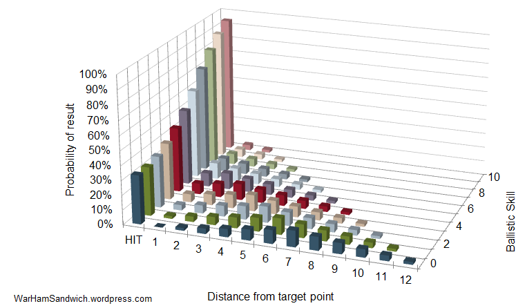 Since the the BS value is subtracted from the scatter distance, you can clearly see the maximum scatter get smaller with each step increase in BS. So looking at the BS10 scatter (all the way at the back in pink) it’s a 94% chance of a hit, 4% chance of a 1 inch scatter, and a 2% chance of a 2 inch scatter.