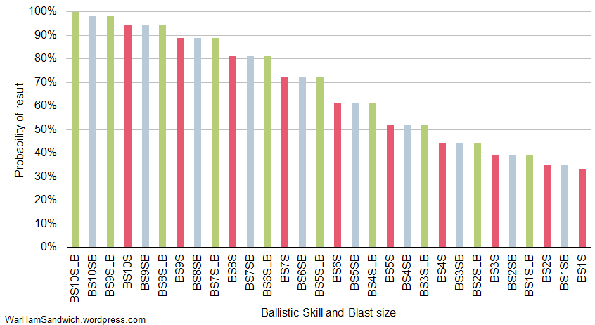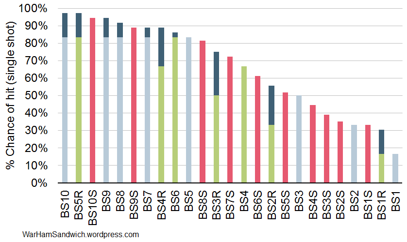 First up, regular BS accuracies with blast accuracies added (in pink). The blast accuracies are the probability of hit but disregarding the radius of the blast (i.e. the odds of the centrepoint hitting your desired target point). Blue columns are ‘regular’ shots, green are twin linked, and pink are blast. Hmmm I guess I left out twin linked blast, guess that’ll have to wait.