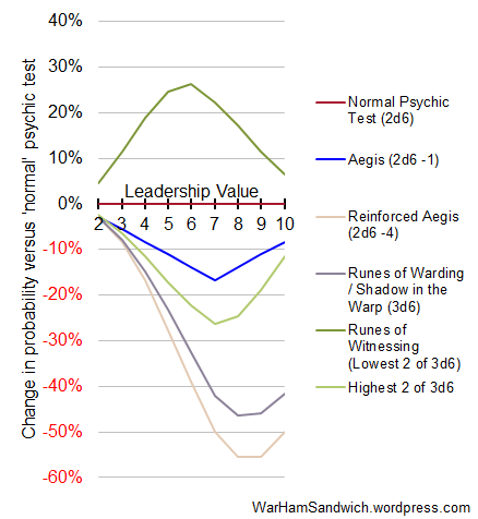 This shows specifically what these defenses are worth against a given Ld. The Normal Psychic test is a flat red line as it compares exactly to itself (if you get what I mean). Runes of Witnessing are above the line as they improve the odds of casting, and the defenses are below the line because they reduce the odds of passing.