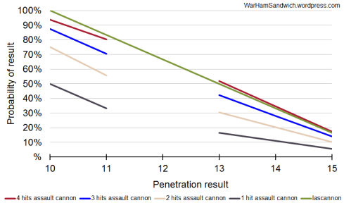 So, what does this show? Well, assuming the parking lot of tanks is the only other unit in the area then unsurprisingly the further away you place them the less likely they are to scatter on to the enemy and mishap. But playing it safe won’t necessarily get you within the all important 6″ melta range. Here’s the interesting bit, I had originally thought that putting the terminators 1″ away from the tanks would get you the highest probability of being in melta range with a trade off of slightly higher odds of mishap. But I was quite wrong. The odds of getting safely in melta range stay pretty flat if you originally place the model between 1″ and 6″ away, but the odds of a mishap are about 45% at 1″ but fall to about 25% at 6″. So the tradeoff I mentioned in my opening question, doesn’t really exist – you can play it (relatively) safe and still go for the close range shot.